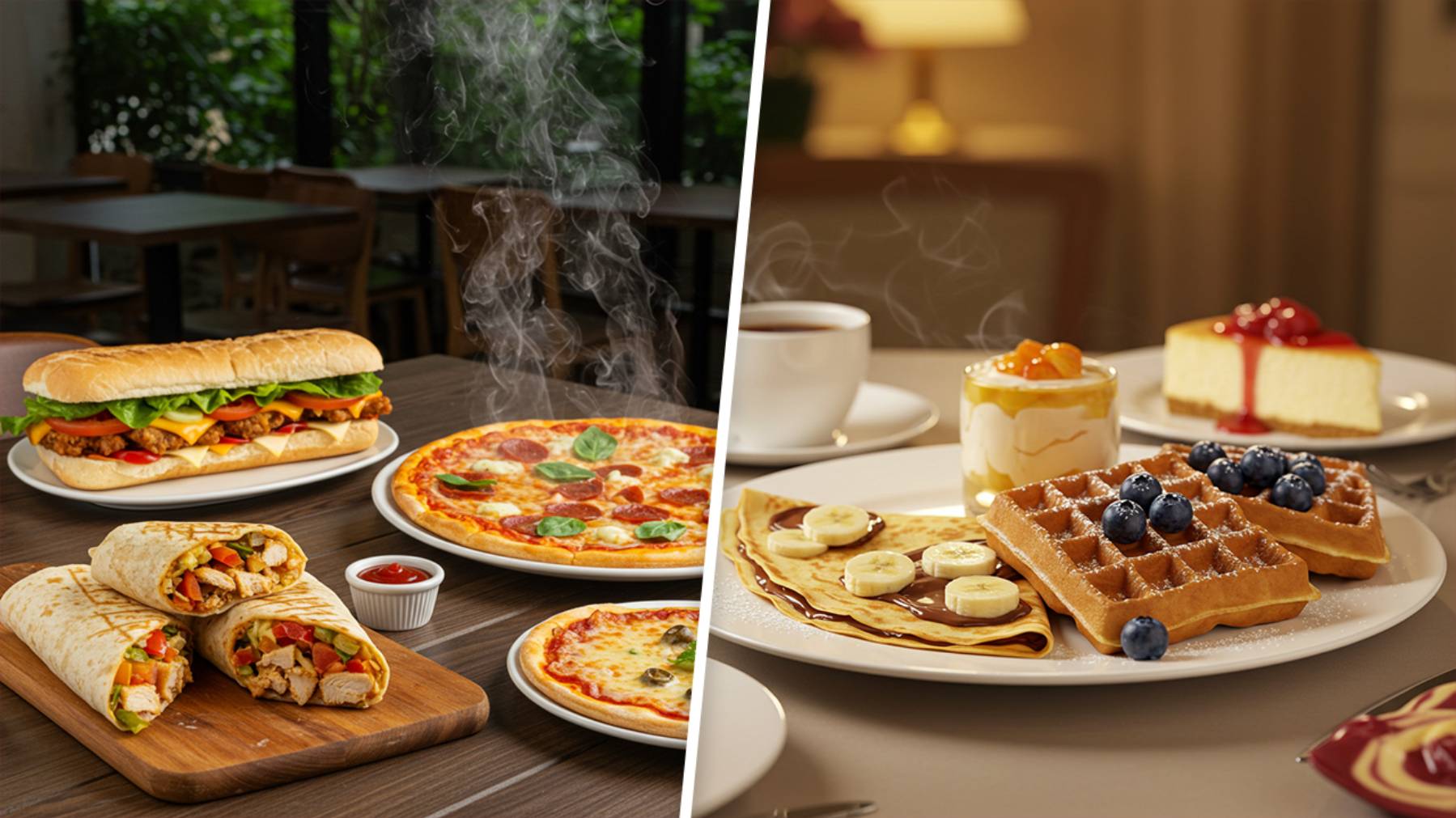 Burgers, Sandwichs, Tacos, Pizza, Crêpes & Gauffres, Gâteaux & Desserts, Plats, Salades, Boissons natures