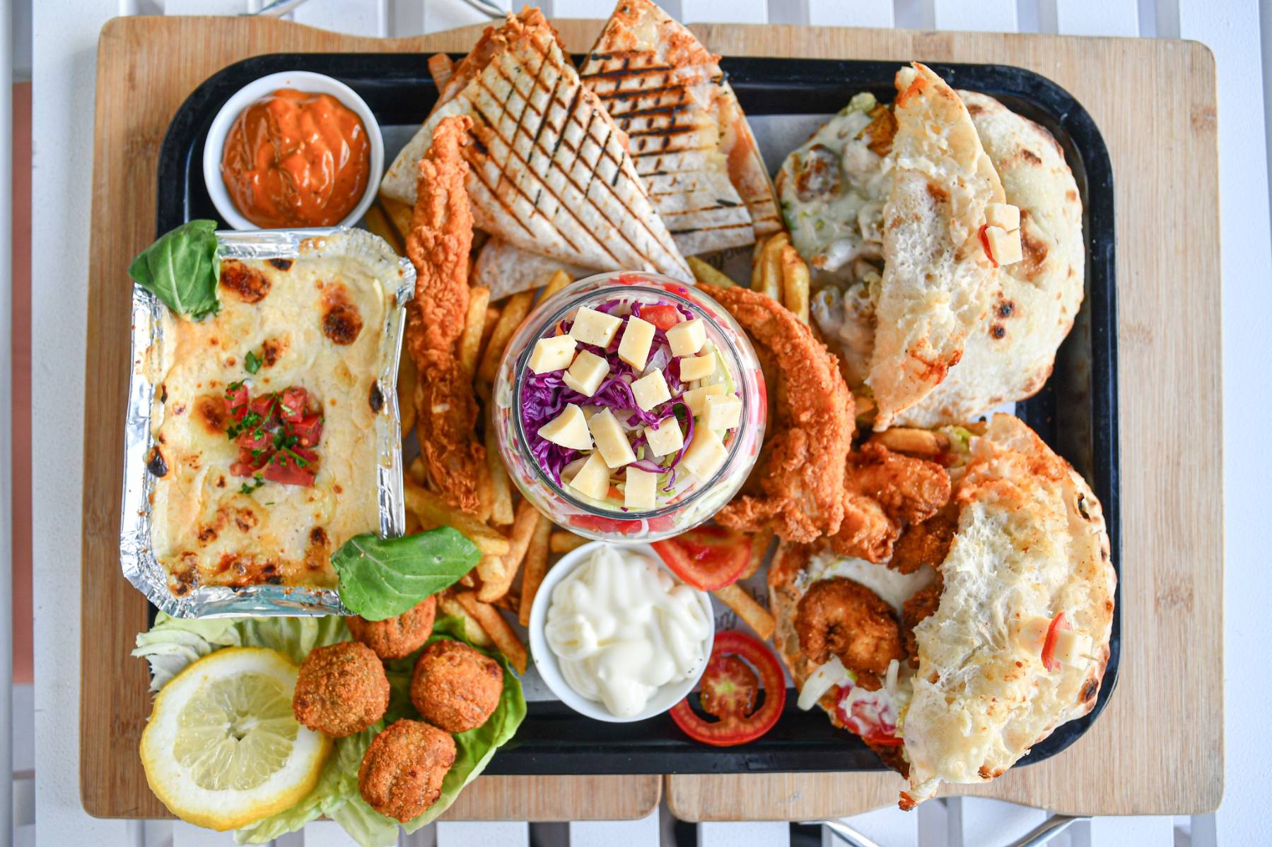 Une planche aux trésors de la mer contenant un poisson, daurade grillée, et un assortiment de fruits de mer grillées ou sautées accompagnés de riz ou pasta, salade et frites