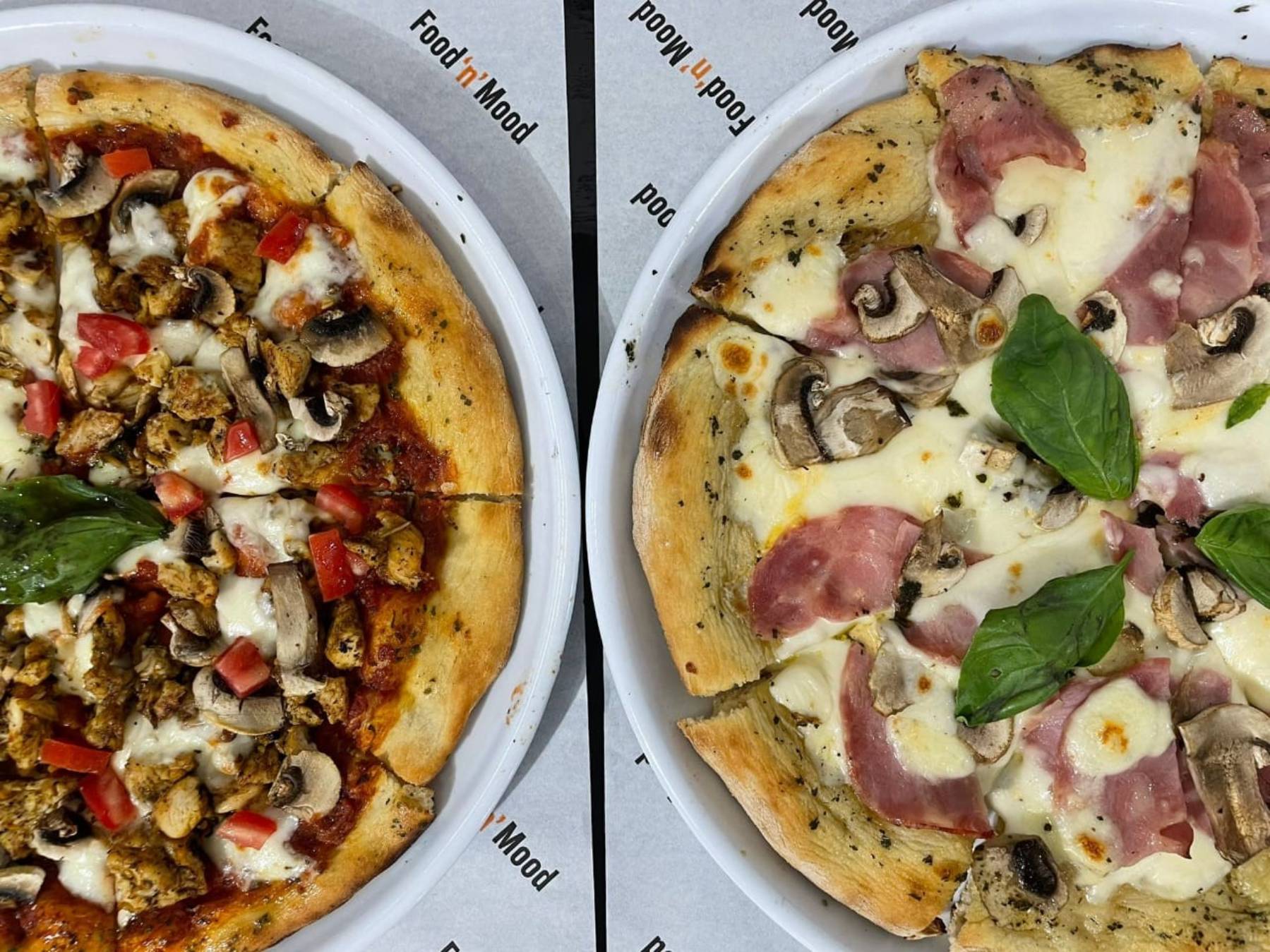 Sauce blanche, mozzarella, escalope de poulet, champignons.