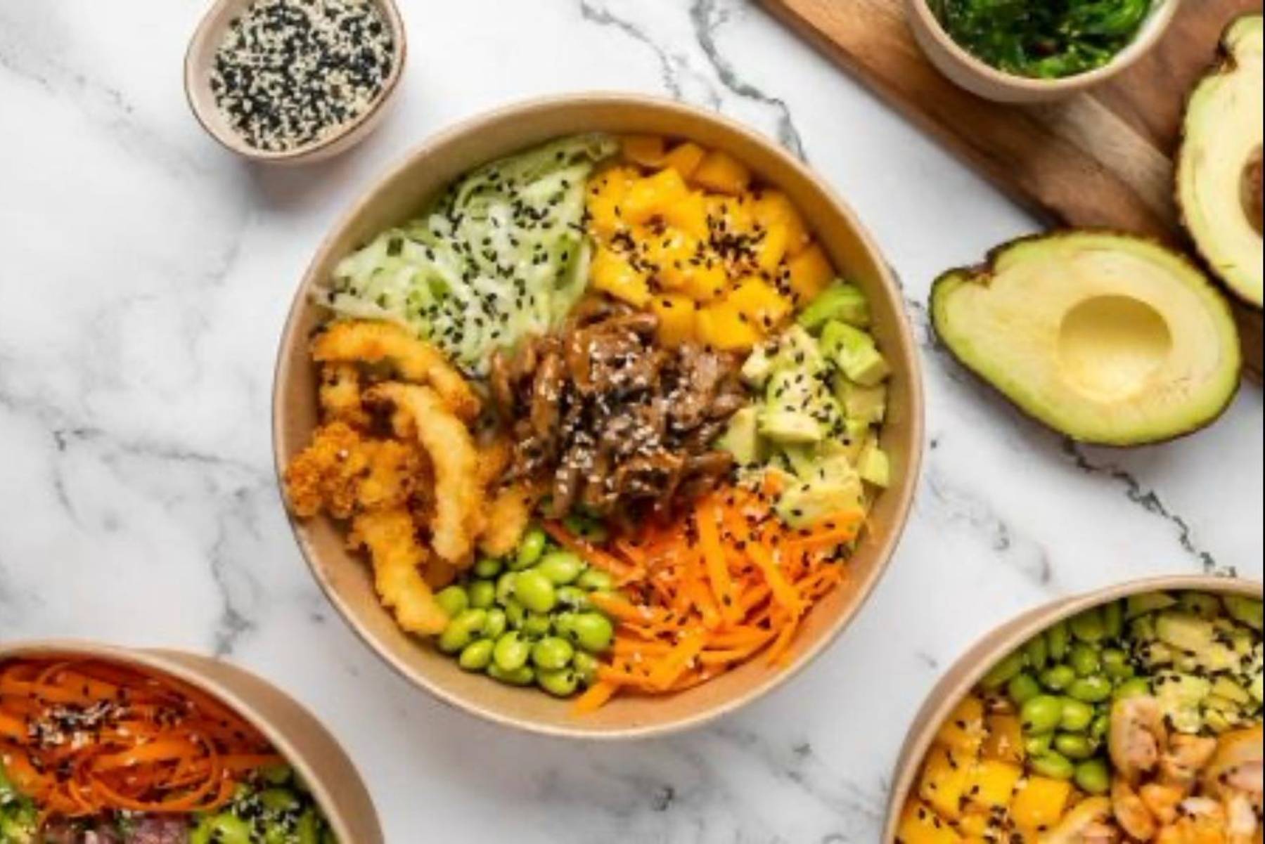 Poké Saumon Crevettes(Saumon frais, Crevettes panées tempura, avocat, edamame, wakame, mangue, concombre, carotte, choux rouge, graines de sésames.)