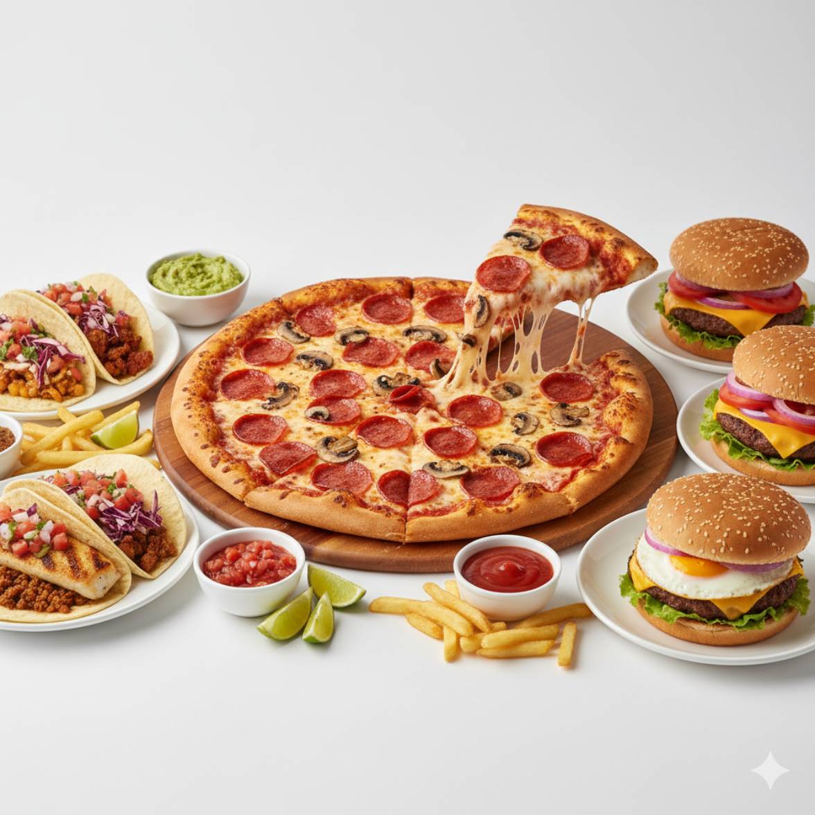 Pizza, Tacos, Plats, Burgers, Sandwichs