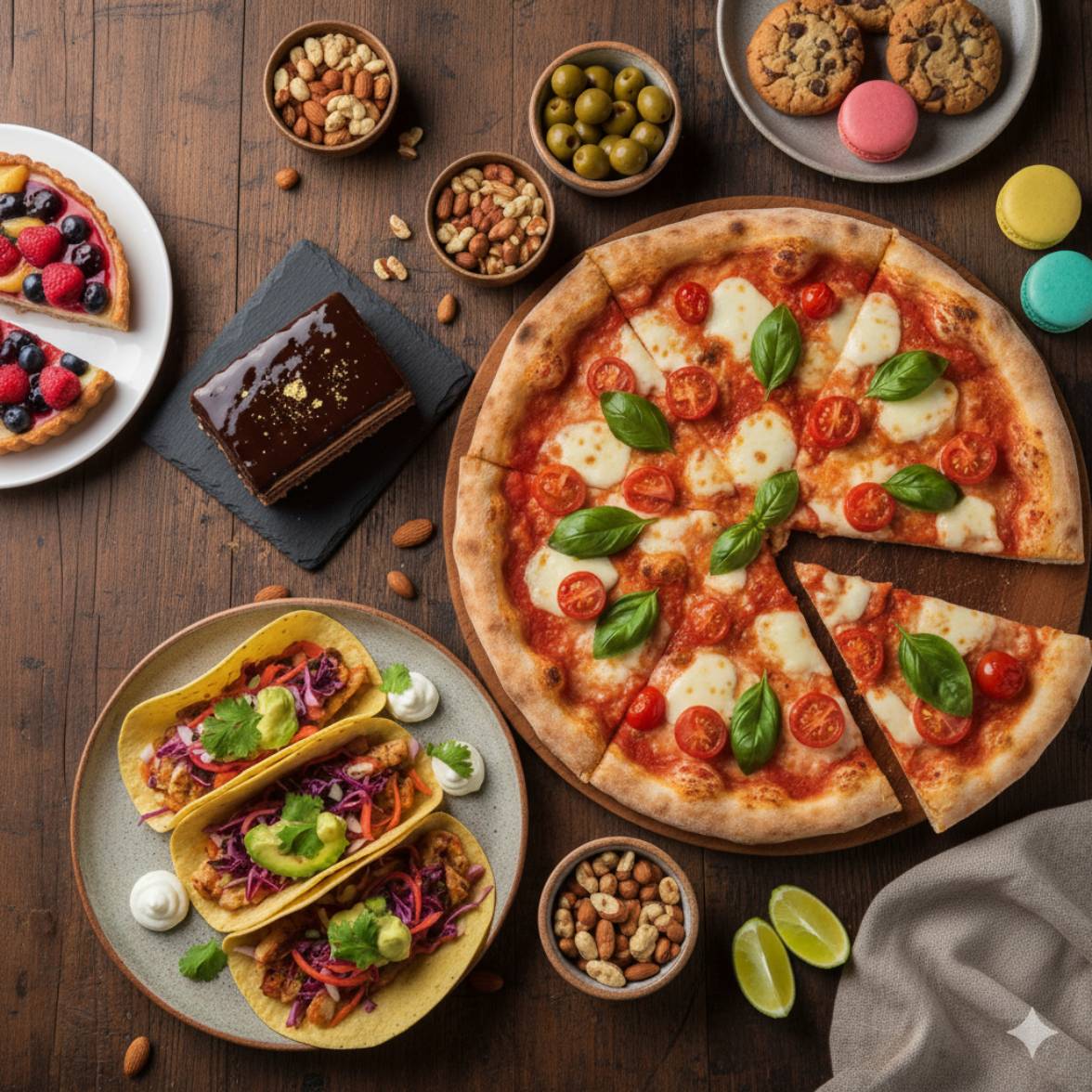 Burgers, Salades, Sandwichs, Pizza, Boissons natures, Pâtisserie, Tacos, Gâteaux & Desserts