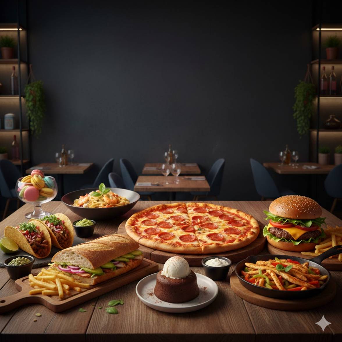 🥪 Sandwich, 🍔 Burger, 🍝 Pâtes, 🍕Pizza, Sweets, 🌮 Tacos, 🍗 Poulet
