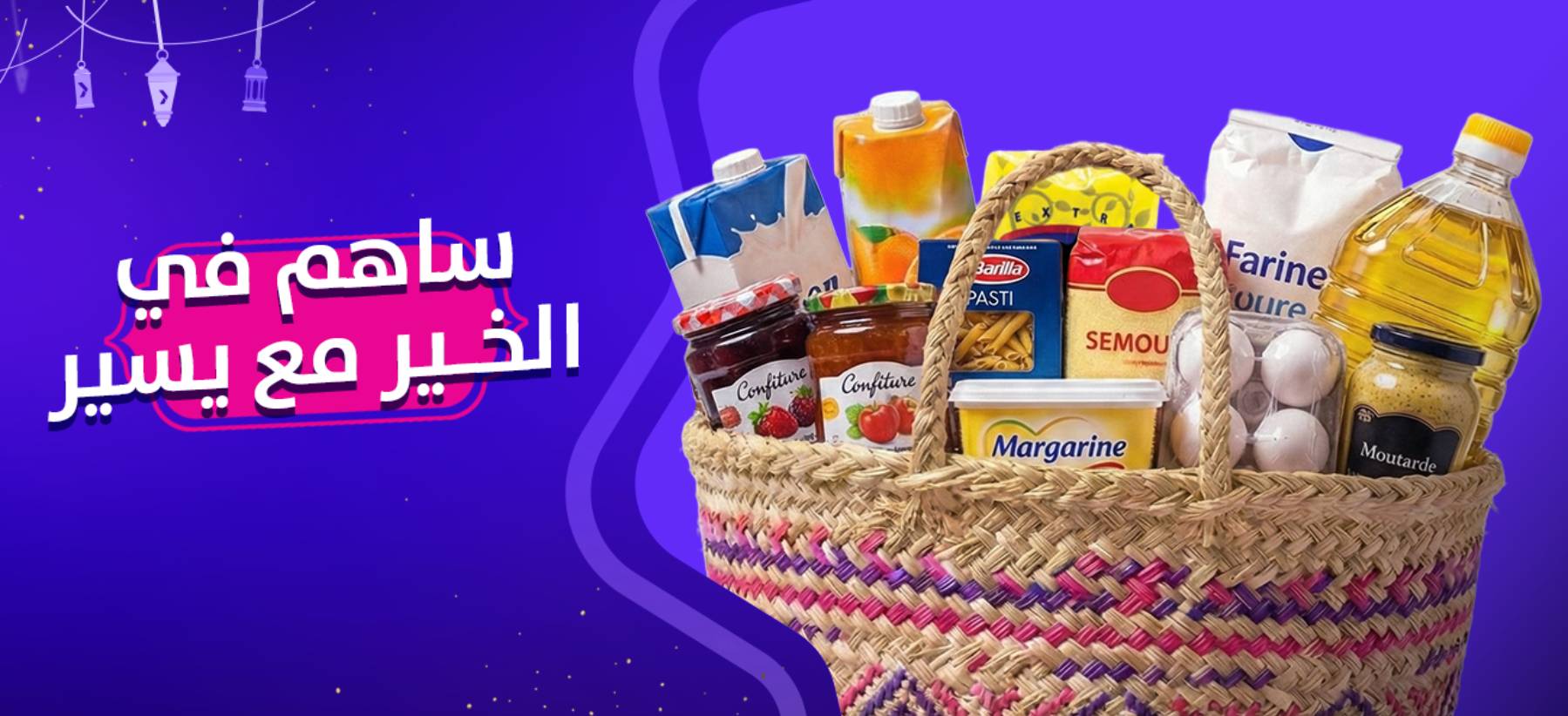 A curated Ramadan basket containing essential products commonly purchased during the holy month. The basket may include a mix of food staples and household items.