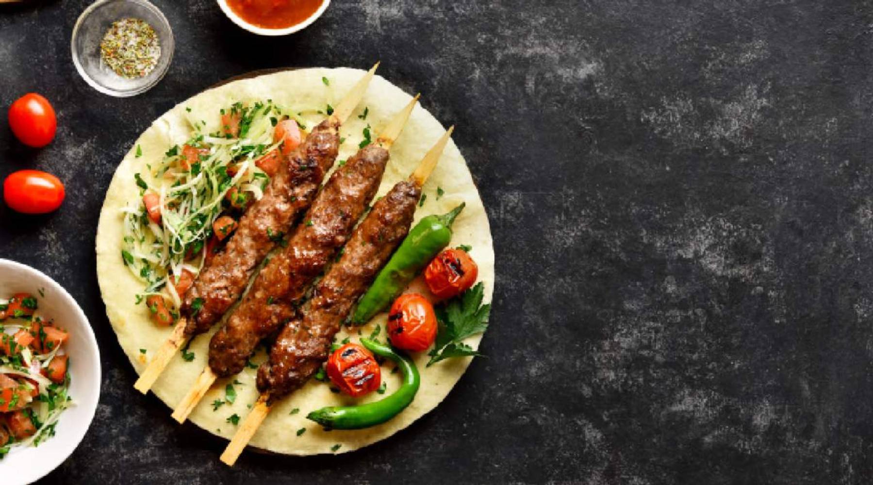 Des rouleaux de pain saj grillé, farcis de tranches de poulet marinées aux épices palestiniennes, servis avec une salade au choix et une sauce à l'ail ou au tahini - un goût qui fond dans la bouche !