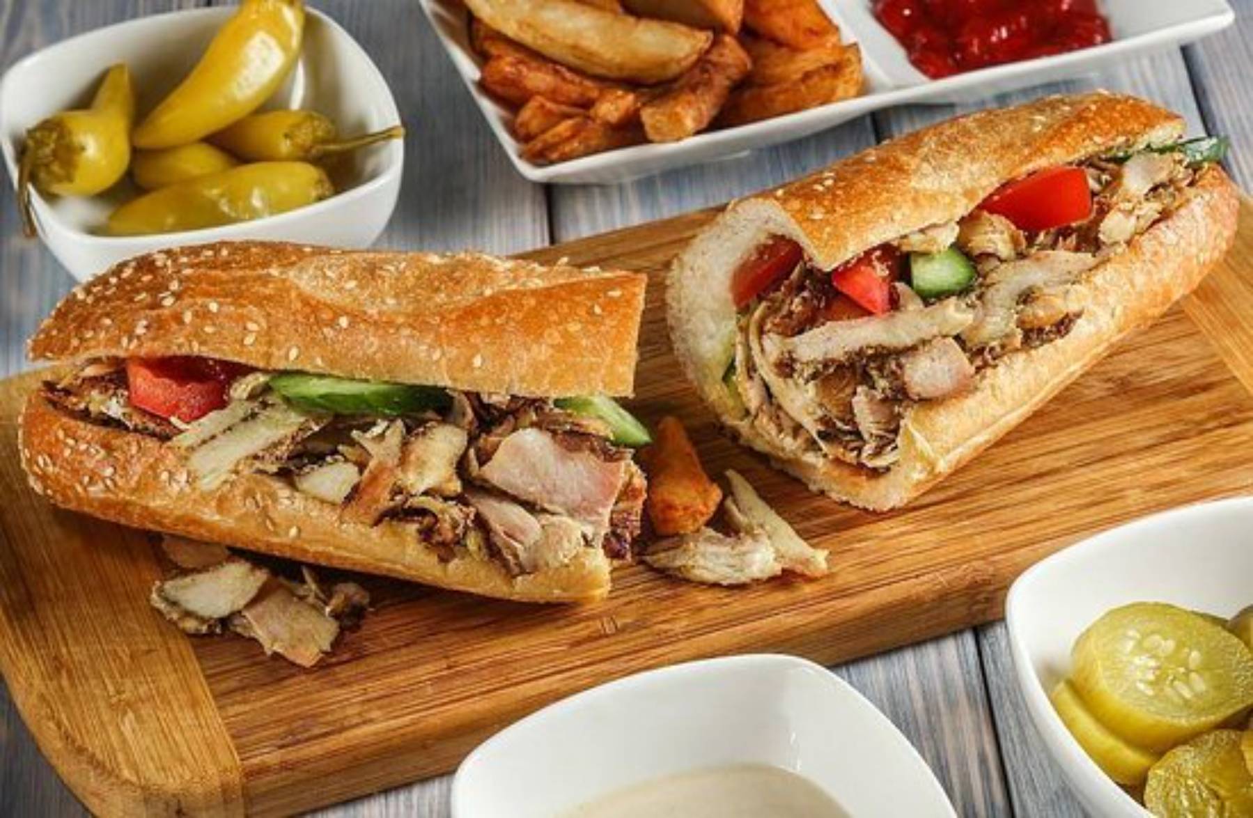 Baguette Farcie Kabeb (2Pcs)Salade mechouia, tastira, salade vert, harissa arbi, oignons, riz blanc