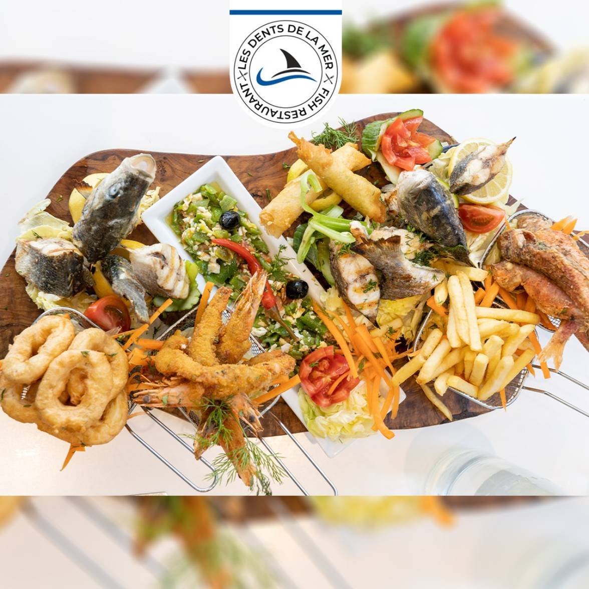 Crevettes GrilléesLoup, daurade, calamar doré, croquettes de crevettes, fritures de rougets, tastira, frites.