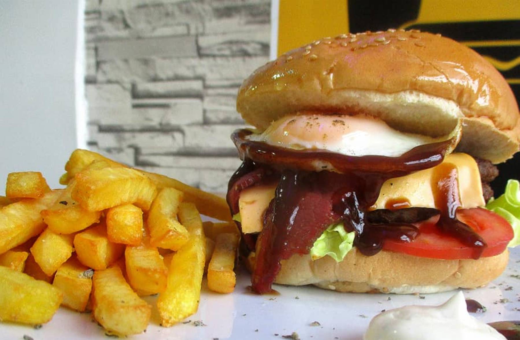 Laitue, tomate, fromage slice, steak de dinde, sauce à l'ail, harissa.