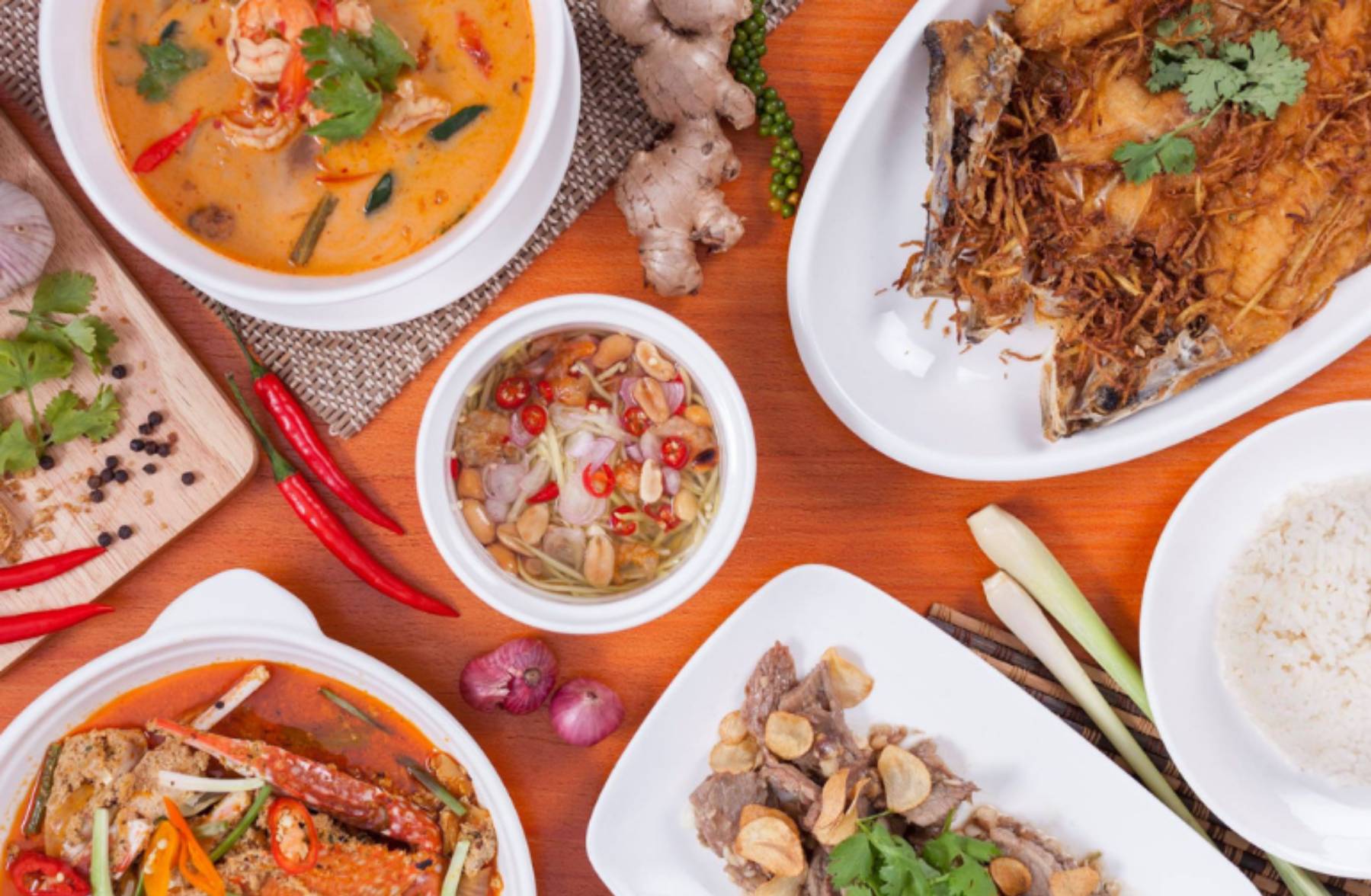 Itim katiSaumon au épices et herbe à la façon thaï Sauce poisson, jus de citron vert, sucre, riz grille, coriandre, menthe, pat de piment, échalote