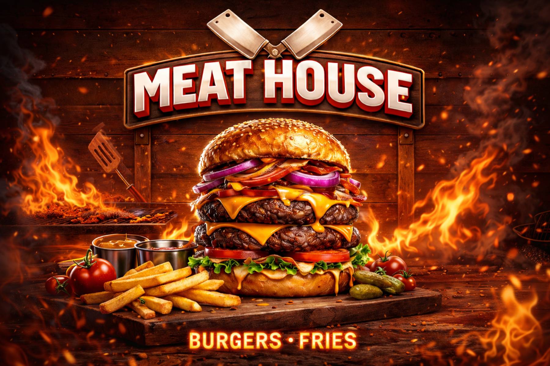 Burger Meat HousePain maison, Sauce chef, Sauce tartare, Double viande hachée (2 x 120g), Double fromage cheddar, Tomate, Laitue, Oignon caramélisé, Cornichons.