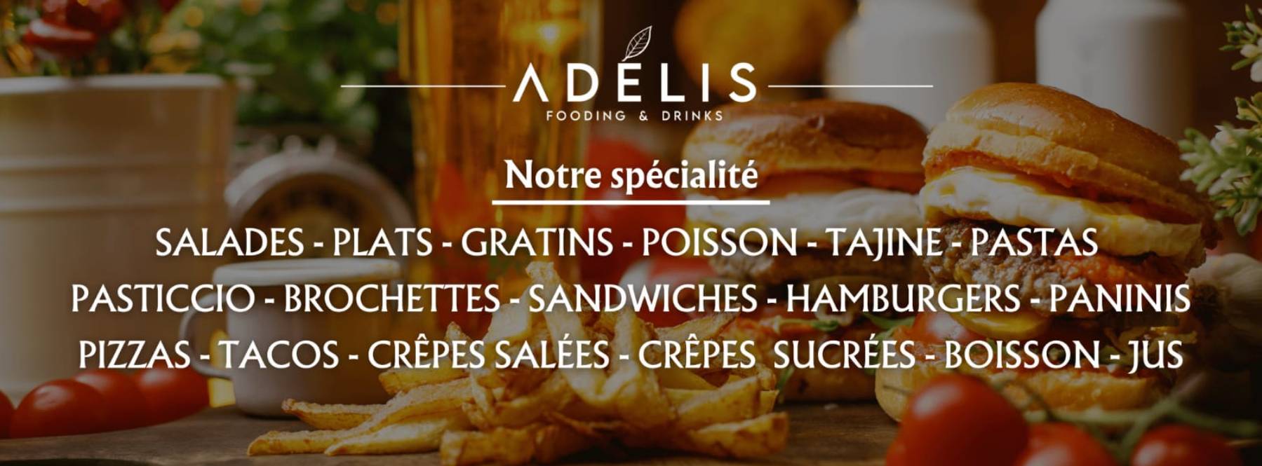 🍔 Burger, 🍕Pizza, 🌮 Tacos, 🥤 Jus, 🍩 Douceurs
