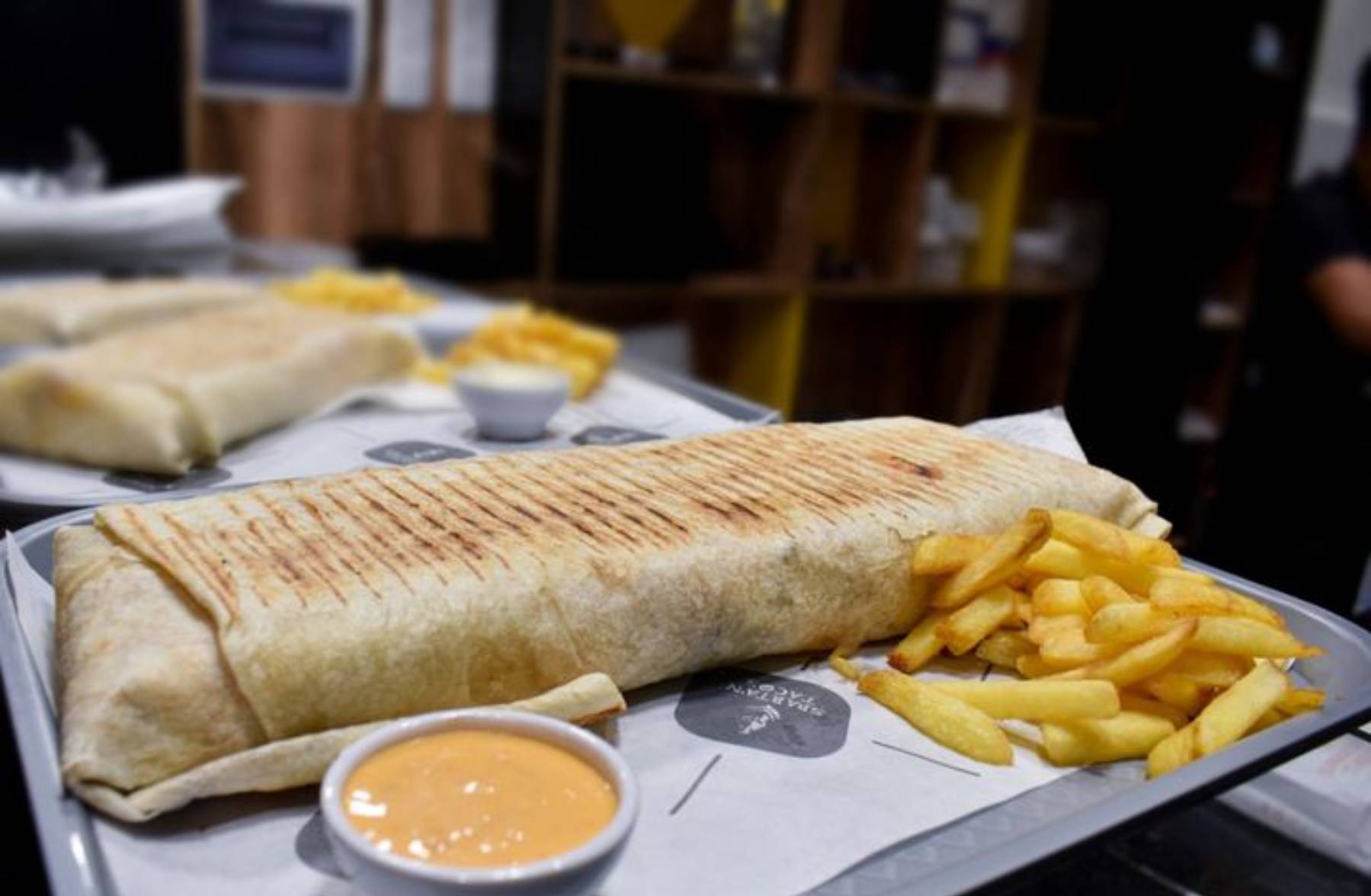 Tacos XL3 viandes , 3 galettes , frites , sauce fromagère.